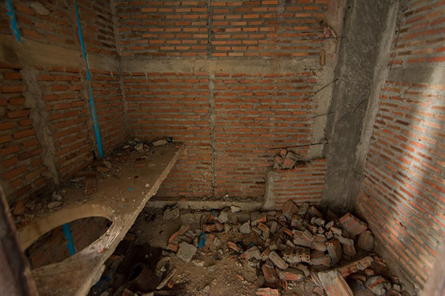 ห้องนี้ยังไม่ได้ฉาบปูนแต่ก่ออิฐเสร็จเรียบร้อยแล้วน่าจะเป็นห้องน้ำหรือห้องครัวค่ะ