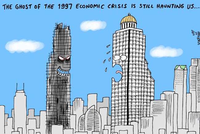 ภาพการ์ตูนขำๆ ระหว่าง State Tower และ Satorn Unique ที่บอกว่า Satorn Unique เป็นผีจากวิกฤติต้มยำกุ้ง