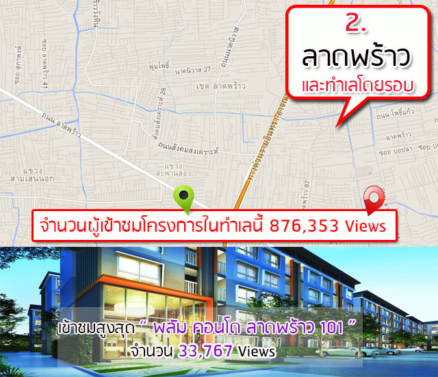 โซนยอดฮิตอันดับที่ 2 ก็เรียกได้ว่าเป็นโซนต่อเนื่องจากอันดับ 1 เลยนั่นก็คือ โซนลาดพร้าวต่อเนื่องไปจนถึงประชาชื่น ซึ่งในช่วงหลายปีที่่ผ่านมาก็มีคอนโดใหม่โผลขึ้นมาอย่างกับดอกเห็ดเลยทีเดียว ทั้งขึ้นตรงริมถนนใหญ่ และในซอย รวมถึงในต้นปีหน้าตรงสี่แยกลาดพร้าว-รัชดาก็น่าจะเห็นโครงการใหม่ล่าสุดอีก 2 โครงการแบรนด์ Chapter One และ Whizdom Avenue โดย 3 อันดับแรกโครงการในย่านนี้ที่มีผู้เข้าชมเยอะที่สุด คือ