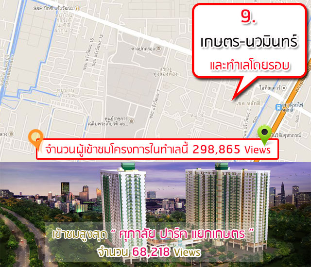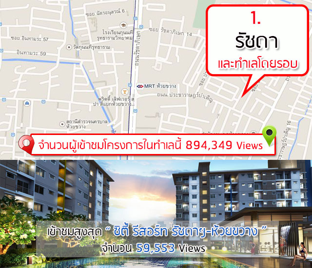 อันดับ 1 มาแล้วค่ะ เรียกได้ว่า No Surprise คือโซนรัชดาภิเษก และแยกพระราม 9 นั่นเอง สาเหตุหลักๆ ก็เนื่องจากถนนเส้นนี้มีรถไฟฟ้าใต้ดินวิ่งผ่าน และสี่แยกพระราม 9 ก็ได้รับการจับตาว่าจะเป็น "New CBD" แห่งใหม่ของกรุงเทพ โดย 3 โครงการที่มีคนเข้าชมมากที่สุดในย่านนี้บนเว็บไซต์เราก็คือ