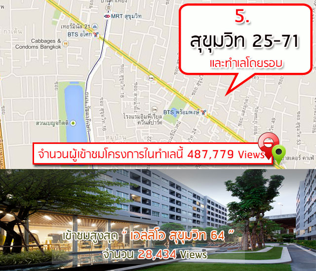 สุขุมวิทช่วงต้นไม่ติด 10 อันดับในที่นี่ แต่สุขุมวิทช่วง 25-71 ซึ่งกินพื้นที่ทองหล่อ และเอกมัยด้วยติดโผมาในลำดับที่ 5 บริเวณนี้รายล้อมไปด้วยห้างสรรพสินค้า โรงแรม ร้านอาหาร ตอบโจทย์ไลฟ์สไตล์ของคนรุ่นใหม่ และให้ผลตอบแทนในด้านการลงทุนสูง จึงให้ทำเลนี้เป็นที่ต้องการของทั้งชาวไทย และชาวต่างชาติเป็นจำนวนมาก โดยคอนโด 3 อันดับแรกที่มียอดผู้เข้าชมเยอะที่สุดในเว็บไซต์ของเราคือ