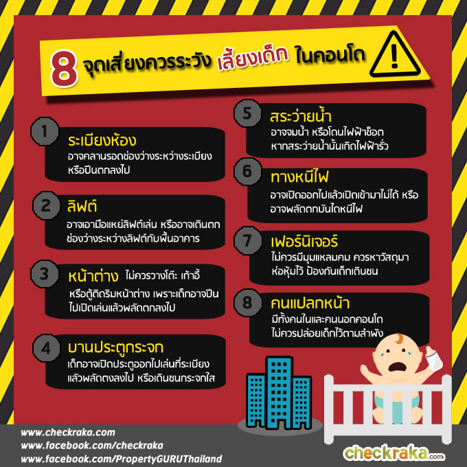 ปัจจุบันการพักอาศัยบนตึกสูงๆ หรือคอนโดมิเนียมเป็นรูปแบบที่กำลังได้รับความนิยม เพราะการเดินทางที่สะดวกสบายอยู่ในตัวเมืองหรืออยู่ในระยะที่ใช้รถไฟฟ้าได้ แต่ด้วยการออกแบบและสภาพแวดล้อมต่างๆ บนตึกสูงในปัจจุบัน อาจจะยังไม่ได้ให้ความสำคัญกับเด็กที่จะเข้ามาอยู่ด้วยมากนัก บวกกับวัยอันซุกซน ความอยากรู้อยากเห็น และความรู้เท่าไม่ถึงการณ์ของเด็กๆ ด้วยแล้ว จึงทำให้หลายๆ จุดบนคอนโดอาจกลายเป็นจุดเสี่ยงที่อาจะเป็นอันตรายต่อเด็กๆ ได้ จะมีจุดไหนบ้างที่เราควรระวังไปดูกันค่ะ