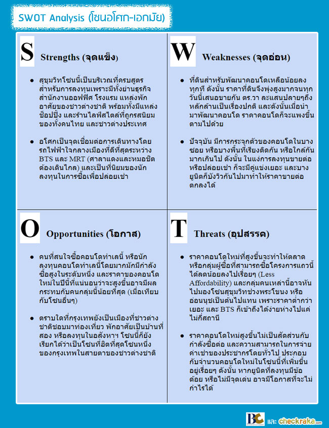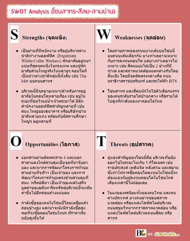 จากผลการสำรวจของ Bangkok CitiSmart จำนวนห้องชุดในทำเลนี้มีไม่เยอะ คือมีอยู่เพียง 5% ของห้องชุดทั้งหมดในกรุงเทพฯ โดยโซนนี้จะเริ่มตั้งแต่บริเวณสามย่าน พระราม 4 ช่วงลุมพินีถึงสามย่าน สีลม และสาทร เรามาดู SWOT Analysis ของ Checkraka ในทำเลนี้กันค่ะ