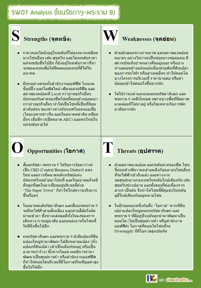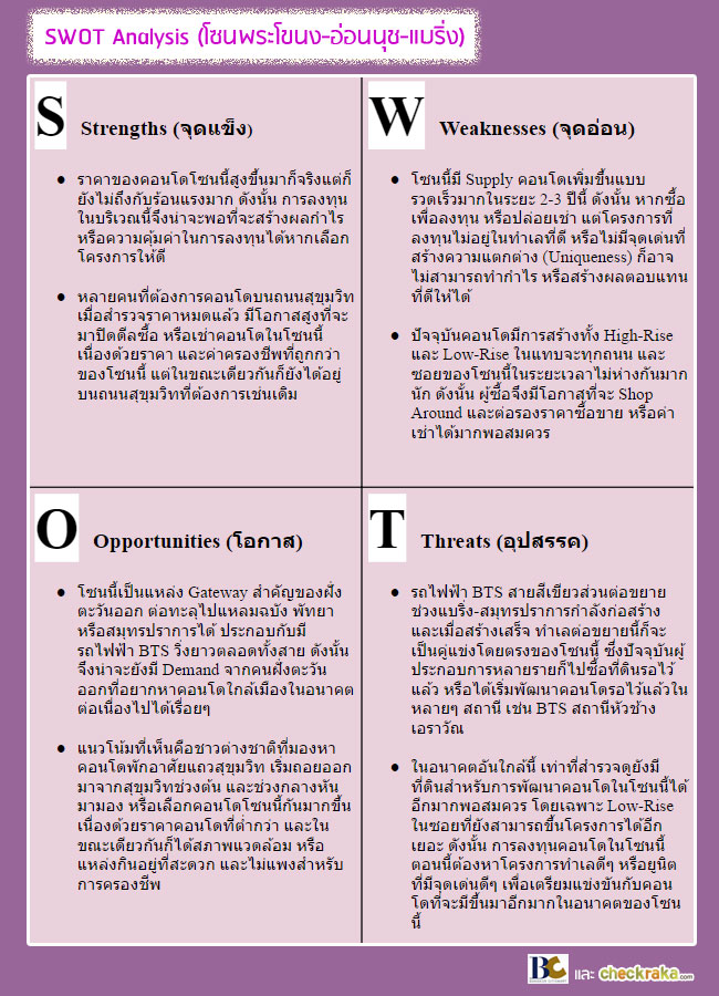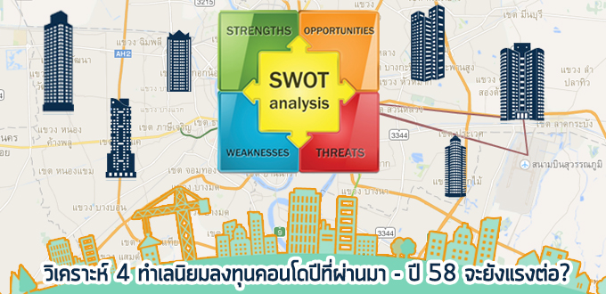 ปีนี้กระแสการลงทุนคอนโดสำหรับปี 58 จะยังมีแรงไปต่อได้อีกหรือไม่? และจะไกลแค่ไหน? นี่คือคำถามน่าสนใจของปีนี้เมื่อพิจารณาถึงว่าช่องว่างระหว่างราคาคอนโด และรายได้ของประชาชนทั่วไปกำลังขยับห่างออกไปเรื่อยๆ ประกอบกับตัวเลขการปฏิเสธเงินกู้ที่อยู่อาศัยของธนาคารก็มีแนวโน้มสูงขึ้น วันนี้ Checkraka เรามาลองทำ SWOT Analysis ทำเล 4 โซนซึ่งตามสถิติคนค้นหาคอนโดของ Bangkok CitiSmart ปี 2556-2557 เป็นทำเลที่คนนิยมหาซื้อ ปล่อยเช่า และลงทุนกันมากที่สุด เรามาดูกันว่า 4 ทำเลนี้มีที่ไหน และเรามีมุมมองกับทำเลเหล่านี้อย่างไรกันค่ะ