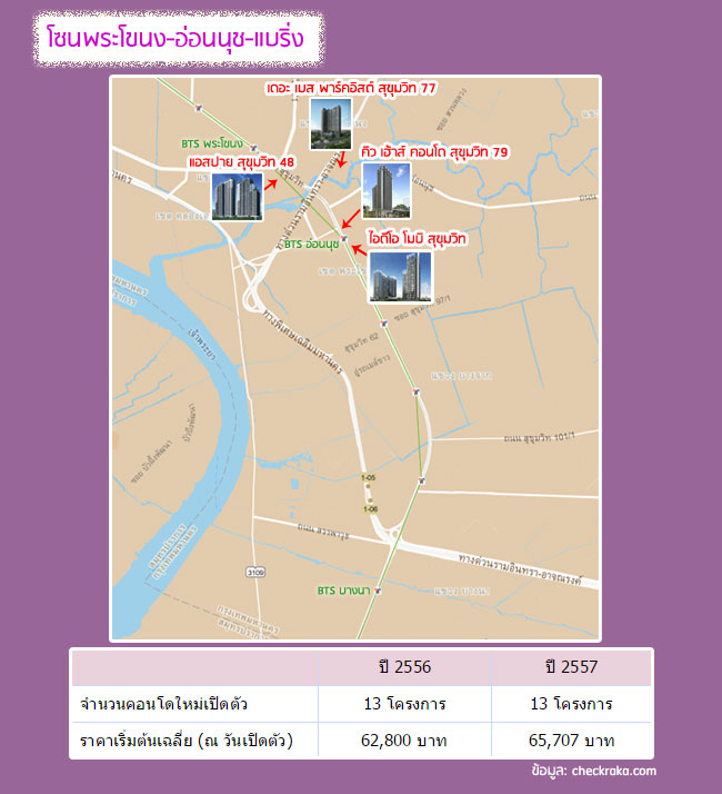 จากผลการสำรวจของ Bangkok CitiSmart โซนพระโขนง-อ่อนนุช-แบริ่งถือว่าเป็นโซนที่มีจำนวนห้องชุดที่มากที่สุดในกรุงเทพฯ คือมีถึง 20% ของห้องชุดทั้งหมด เนื่องจากเป็นส่วนต่อขยายรถไฟฟ้า ราคาที่ดินยังไม่สูงมาก และยังมีที่ดินให้พัฒนาโครงการขนาดใหญ่อีกจำนวนมาก สำหรับโซนนี้จะกินอาณาบริเวณตั้งแต่ BTS พระโขนงยาวไปตามแนวรถไฟฟ้าจนถึงสถานี BTS แบริ่งค่ะ