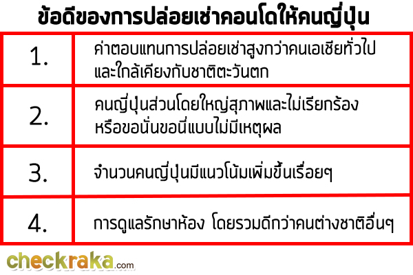 มีคนญี่ปุ่นจำนวนไม่น้อยที่มาอยู่เมืองไทยแล้วไม่ได้เลือกที่จะอยู่คอนโดมิเนียม แต่เลือกที่จะอยู่ Serviced Apartment โดยเฉพาะชาวญี่ปุ่นที่มาเป็นครอบครัว เพราะชอบความสะดวกสบายหลายๆ อย่าง เช่น บริการทำความสะอาด ระบบรักษาความปลอดภัย เป็นต้น ดังนั้น ก่อนที่จะปล่อยเช่าคอนโดของเรา เราอาจลองเข้าไปเดินเล่นดูคู่แข่ง Serviced Apartment ดีๆ ที่ดึงดูดผู้เช่าญี่ปุ่นได้เยอะๆ ว่าห้องเขามีดีอะไรบ้าง และมีสิ่งอำนวยความสะดวกอะไรที่ดึงดูดใจคนญี่ปุ่น เมื่อเราได้เห็นภาพมีข้อมูลพวกนี้แล้ว เราอาจจะปรับแต่งห้องคอนโดของเราให้โดนใจ หรือเป็นที่สนใจของคนญี่ปุ่นได้มากขึ้น