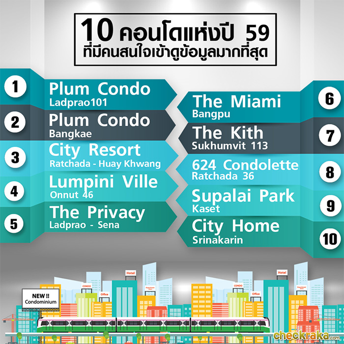 10 คอนโดแห่งปี 59 ที่มีคนสนใจเข้าดูข้อมูลมากที่สุด ในเว็บไซต์ CheckRaka.com
