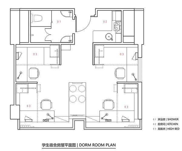 ภายในห้องที่เราจะพาไปดูนั้นเป็นห้องรวมค่ะ จุสมาชิกได้ 4 คน ถูกจัดแบ่งออกอย่างเป็นสัดเป็นส่วน มีมุมอ่านหนังสือหรือทำการบ้านส่วนตัว เตียง 4 เตียงจะจัดอยู่ในมุมที่ดูแล้วไม่รกเกะกะ มี 1 ห้องครัว 1 ห้องน้ำ ที่ถูกแยกออกไปจากบริเวณพื้นที่ส่วนตัว