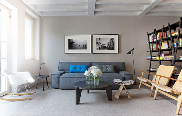 3. โซฟาสีเทา+ผนังสีขาว แอบเท่ด้วยชั้นหนังสือสีดำ