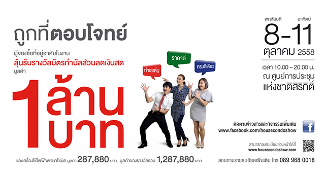พลาดไม่ได้สำหรับผู้ที่กำลังมองหาบ้านและคอนโดคุณภาพ พบงานอสังหาริมทรัพย์ที่ยิ่งใหญ่ที่สุดของประเทศ มหกรรมบ้านและคอนโด ซึ่งจัดโดยสมาคมอสังหาริมทรัพย์ไทย ร่วมกับสมาคมอาคารชุดไทย และสมาคมธุรกิจบ้านจัดสรร ระหว่างวันที่ 8 - 11 ตุลาคม 2558 เวลา 10.00 - 20.00 น. ณ ศูนย์การประชุมแห่งชาติสิริกิติ์