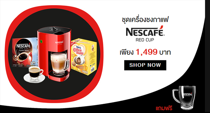 ยกระดับกาแฟแก้วโปรดของคุณได้ทุกวันกับ เครื่องชงกาแฟ NESCAFÉ Red Cup ชุดเครื่องชงกาแฟสำเร็จรูป NESCAFE RED CUP พร้อมของแถมสุดคุ้ม เนสกาแฟเรดคัพ 1 กล่อง / เนสท์เล่ คอฟฟีเมต 1 กล่อง และ แก้วใสเนสกาแฟ 1 ใบ รวมทั้งชุดในราคาสุดคุ้มเพียง 1,499 บาท (จากปกติ 2,328 บาท) แค่ 7 วันเท่านั้น