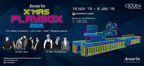 ช่วงเย็นๆ กับบรรยากาศใกล้สิ้นปี ถ้าเพื่อนๆ กำลังมองหาที่เดินเล่นเพื่อช้อป ชิม ชิล เราแนะนำให้ลองไปงาน “Amarin X’mas Play Box 2015” ที่ลานหน้าห้างสรรพสินค้าอัมรินทร์ พลาซ่า เพราะเขาเนรมิตสถานที่ ขนตู้คอนเทนเนอร์มาออกร้าน ตาม Theme “Play Box” พร้อมด้วยขบวน Food Truck อร่อยไม่ซ้ำที่หมุนเวียนสับเปลี่ยนมาเสิร์ฟความหลากหลายให้พวกเราได้เดินเล่นช้อป ชิม ชิล บวกดูโชว์มินิคอนเสิร์ตจากสองวงดังอย่าง Mind และ The Parkinson สุดเข้าบรรยากาศกับปาร์ตี้หน้าหนาวที่ไม่ค่อยหนาว ณ ริมถนนราชประสงค์ งาน Event มี Theme ครั้งนี้จัดถึงแค่ 8 มกราคม 2559 นี้เท่านั้นค่ะ