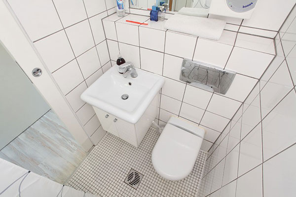 ถัดจากมุมครัว บริเวณใต้เตียงนอนเช่นกัน จะเป็นห้องน้ำห้องเล็ก ที่มีสุขภัณฑ์อยู่ครบครัน