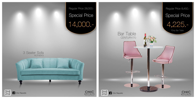 บริษัท ชิค รีพับบลิค จำกัด โฮมแฟชั่นสโตร์แห่งแรกและแห่งเดียวในประเทศไทยที่รวบรวมเฟอร์นิเจอร์และของแต่งบ้านที่มีเอกลักษณ์เฉพาะตัวมากที่สุด จับกระแสไทยแลนด์ 4.0 ปล่อยแคมเปญออนไลน์ "CHIC OFFERS SALE 50%" ให้ลูกค้าได้ร่วมสนุก เพียงกดไลค์และติดตาม แฟนเพจ Chic Republic สามารถเลือกซื้อสินค้าเฟอร์นิเจอร์และของตกแต่งบ้าน สไตล์ ชิคๆ ที่เข้าร่วมแคมเปญในราคาส่วนลดพิเศษ 50% รับฟรีบัตรสมาชิก Chic Republic สามารถนำไปเป็นส่วนลด 5% กับสินค้าในสโตร์ได้ในรอบบิลถัดไป รีบด่วนๆ สินค้าว้าวๆ ชิคๆ มีจำนวนจำกัดนะจ๊ะ ติดตามแคมเปญชิคๆ "CHIC OFFERS SALE 50%" ได้ทาง Facebook Chic Republic ทุกวันจันทร์ พุทธ ศุกร์ เวลา 17.00 น. พร้อมสัมผัสสินค้าจริงได้ที่ โฮมแฟชั่น สโตร์ ชิค รีพับบลิค สาขาราชพฤกษ์ และสาขาบางนา เท่านั้น!!