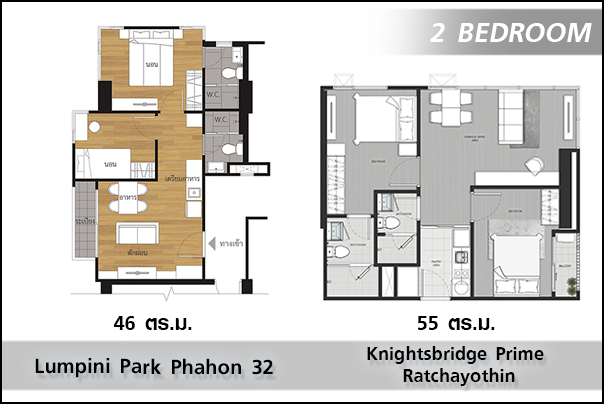- 2 ห้องนอน พื้นที่ใช้สอย 53.7-54.5 ตร.ม.