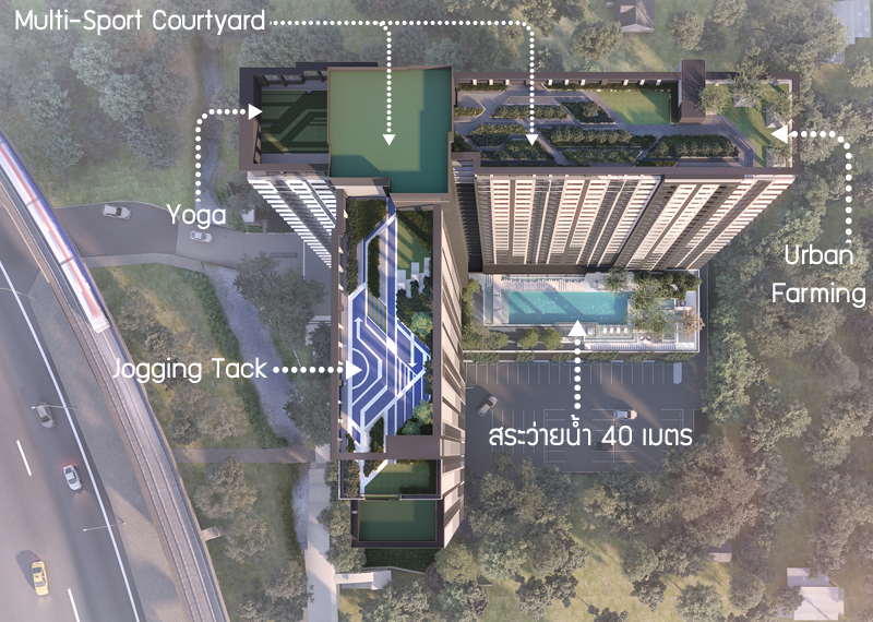 ในส่วนของ Rooftop ของโครงการนั้นเป็นพื้นที่ Multi-Sport Courtyard สามารถออกกำลังกาย เล่นกีฬาได้หลายประเภท มีพื้นที่สำหรับให้เล่นฟุตบอล, วอลเลย์บอล, หรือบาสเก็ตบอล ได้ด้วยค่ะ มี Rooftop Jogging Track และ Yoga Area นอกจากนี้ยังมีโซนสำหรับให้ลูกบ้านเลือกต้นไม้มาปลูกเองได้อีกด้วย สำหรับสระว่ายน้ำจะอยู่บริเวณชั้น 8 มีความกว้างถึง 40 เมตรทีเดียว
