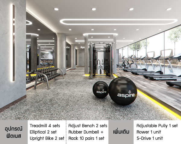 ฟิตเนสจะอยู่บริเวณชั้น 8 ติดกับสระน้ำ สำหรับอุปกรณ์พื้นฐานของแบรนด์ Aspire จะได้เครื่องเล่นตามรูปด้านบน ลิสต์ทางซ้ายมือ แต่สำหรับ Aspire สาทร-ราชพฤกษ์ ได้มีการเพิ่มเติมอุปกรณ์มาอีก 3 เซ็ตด้วยกัน ตามลิสต์ทางขวามือค่ะ เรามาดูภาพบรรยากาศของ Facilities กันค่ะ
