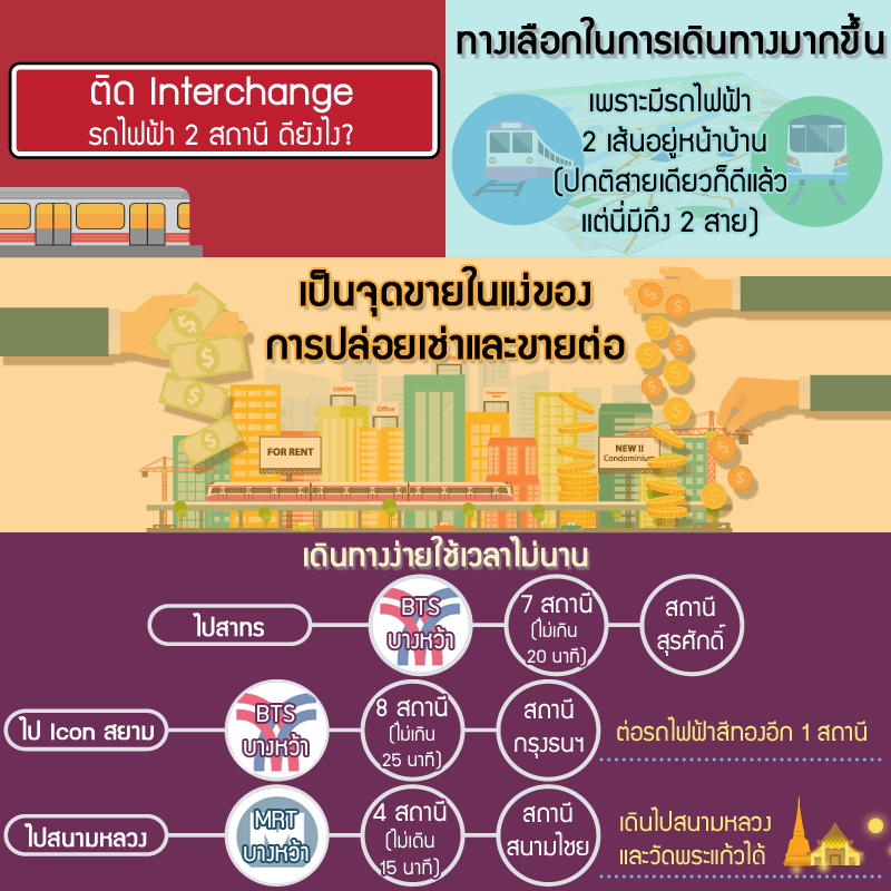 ติดรถไฟฟ้า Interchange บางหว้า เชื่อมต่อ 2 เส้นทาง โครงการตั้งอยู่ติดกับรถไฟฟ้าสถานีบางหว้า ซึ่งเป็นสถานี Interchange ของรถไฟฟ้า 2 สาย คือ BTS สายสีเขียวที่ใช้งานได้ในปัจจุบัน และ MRT สายสีน้ำเงิน ส่วนต่อขยายจากสถานีหัวลำโพง ช่วงหัวลำโพง - บางแค ซึ่งทั้งสองสายสามารถเดินทางเข้าสู่ตัวเมืองได้อย่างสะดวก ไม่ว่าจะไปทำงานในย่านสีลม สาทร ด้วยรถไฟฟ้า BTS หรือจะไปท่าพระ บางแค ด้วยรถไฟฟ้าสายสีน้ำเงิน ซึ่งจะได้เปรียบในเรื่องของการได้ขึ้นตั้งแต่ต้นสาย ไม่ต้องรอหลายขบวนเหมือนสถานีหลังๆ อีกด้วยค่ะ
