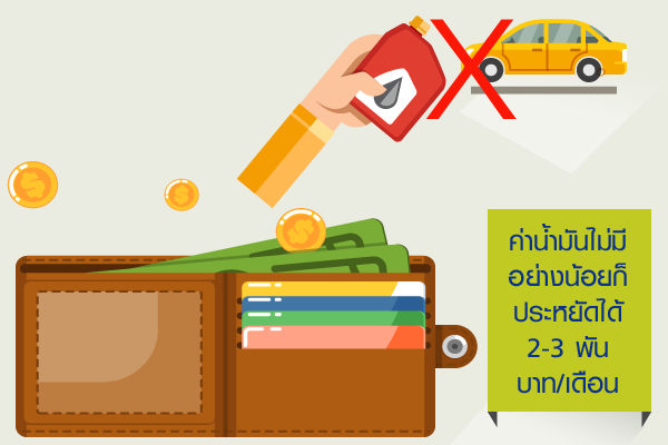 เมื่อเราไม่ต้องซื้อรถ และไม่ได้ใช้รถในการเดินทางหลัก เราก็ไม่ต้องเติมน้ำมัน ก็จะทำให้เราประหยัดค่าน้ำมันไปด้วยนั่นเอง อย่างไรก็ตามโครงการก็ยังอำนวยความสะดวกกับผู้ที่มีรถให้เหมือนกันนะ สำหรับใครที่มีรถ เราอาจจะใช้แค่ยามจำเป็นเท่านั้นจริงๆ ก็ได้ค่ะ