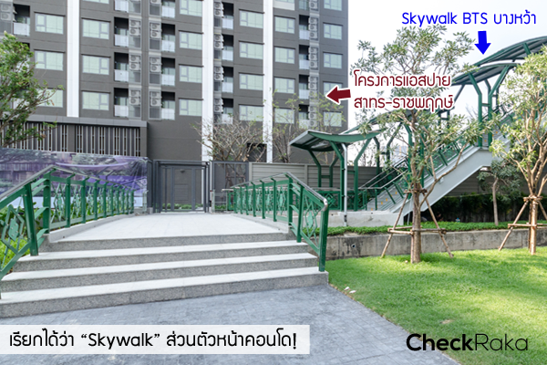 เพียง 1 ก้าวก็ถึง Skywalk รถไฟฟ้าสถานี บางหว้า ตัวโครงการเขาได้ชูจุดเด่นว่า 1 ก้าวก็ถึง BTS บางหว้าแล้ว เท่ากับว่าการเดินทางหลักสามารถใช้รถไฟฟ้าได้สะดวกกว่ารถยนต์นั่นเอง แต่คำว่า 1 ก้าว อันที่จริงก็คือ 1 ก้าวจาก Skywalk ของ BTS บางหว้าค่ะ แต่ถึงอย่างนั้นก็เถอะ มันก็สะดวกมากอยู่ดีเพราะทางขึ้นของ Skywalk อยู่ข้างหน้าโครงการเลย ชนิดที่ว่าเปิดประตูออกไปปุ๊บ ก็เจอบันไดทางขึ้นจ่อหน้าเราเลยทีเดียว ดูจากภาพด้านล่างนี้ก็จะเห็นชัดยิ่งขึ้น