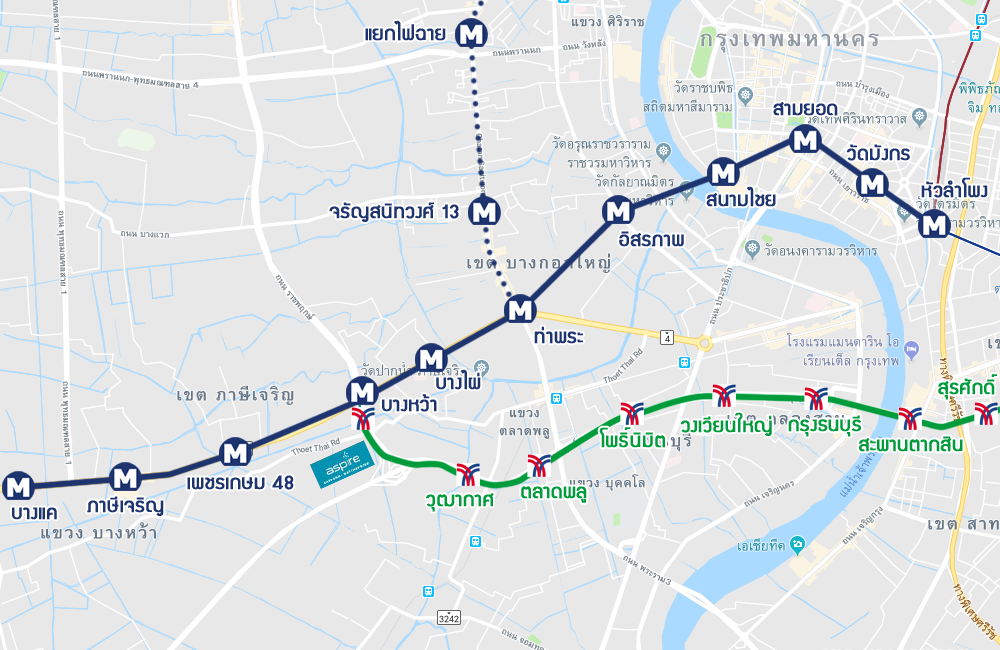 แผนที่แสดงทางเชื่อมของรถไฟฟ้าทั้ง 2 สาย สายสีน้ำเงิน และสายสีเขียว