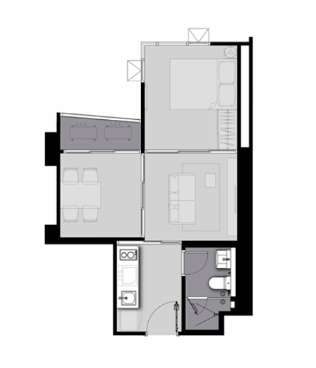 ห้องนี้จะได้เป็นครัวปิดเป็นสัดส่วน มีพื้นที่รับแขก 1 ห้องนอน และ 1 ห้องอเนกประสงค์ที่สามารถทำเป็นห้องนอน ห้องทำงาน หรือห้องแต่งตัวก็ได้ ในส่วนของห้องนอนนั้นจะเป็นพื้นที่ๆ ยื่นออกไปประมาณ 2 เมตรกว่า เหมือนยื่นออกไปในอากาศ พร้อมกระจกเข้ามุม ทำให้มีมุมมองเปิดกว้างขึ้น ใครที่ชอบตื่นนอนแล้วเจอวิวเมืองหรือก่อนนอนอยากชมวิวยามค่ำคืนห้องนี้เหมาะเลยค่ะ ซึ่งแบบห้องนี้มีเพียง 5 ยูนิต/ชั้นเท่านั้น