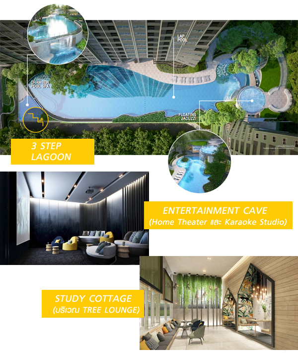 สำหรับส่วนกลางเรียกว่าจัดหนักจัดเต็มไม่มีกั๊ก และให้มาค่อนข้างเยอะกว่าโครงการเพื่อนบ้านในย่านเดียวกัน ออกแบบมาได้น่าใช้งานรองรับไลฟ์สไตล์ที่หลากหลาย กับสระว่ายน้ำ 3 ระดับ ที่มีทั้งโซน Lap Pool, Floating Jacuzzi และโซนธารน้ำตก โอบล้อมด้วยพื้นที่สีเขียว, Tree Lounge มุมอ่านหนังสือ ในบรรยากาศใหม่ๆ, ห้องโฮมเธียร์เตอร์ พร้อมจอขนาดใหญ่ที่เชื่อมต่อกับ Online Streaming Service ได้ จะดูหนัง ฟังเพลง ร้องคาราโอเกะ หรือเล่นเกมก็ทำได้, ห้อง Multifunction Fitness Studio ห้องฟิตเนสรูปแบบใหม่ รองรับหลากหลายฟังก์ชันการใช้งาน ทั้งโซนต่อยมวย ปั่นจักรยาน สตูดิโอออกกำลังกายส่วนตัว พร้อมทีวีขนาดใหญ่ ห้องสตีม ซาวน่า และร้านค้าภายในโครงการ ที่เปิดให้บริการตลอด 24 ชม. หิวเมื่อไหร่ก็ลงมาซื้อได้ตลอด อยู่ที่นี่รับรองไม่มีอด