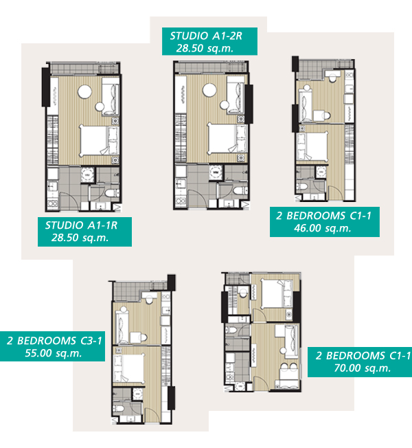 นอกจาก Layout รูปแบบใหม่แล้วก็ยังมีห้องขนาดอื่นๆ ให้เลือกอีกหลาย Type เริ่มตั้งแต่ห้องแบบ Studio - 2 Bedrooms
