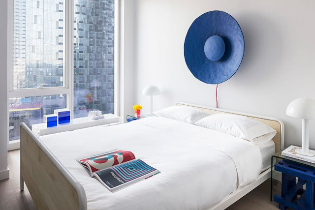 ปกติห้องคอนโดเราจะเป็นสี่เหลี่ยม แต่ถ้าอยากให้ห้องดูแล้ว Wow น่าสนใจมากขึ้น ก็สามารถเลือกเฟอร์นิเจอร์ลอยตัวที่เป็นหลากหลายรูปทรงเรขาคณิตได้ เฟอร์นิเจอร์สมัยนี้มีแทบจะทุกรูปทรงเรขาคณิต ทั้งสี่เหลี่ยมผืนผ้า สี่เหลี่ยมจัตุรัส วงกลม สามเหลี่ยม ห้าเหลี่ยม หรือแม้กระทั่งไม่เป็นทั้งเหลี่ยม หรือกลม จากรูปตัวอย่างข้างล่าง ทุกอย่างเป็นสี่เหลี่ยมหมด ไม่ว่าจะเป็นหน้าต่าง เตียง โต๊ะข้าง ของตกแต่งบนโต๊ะ ดังนั้น ถ้าเอาของตกแต่งเหนือเตียงเป็นทรงกลม และโคมไฟแบบครึ่งวงกลมแบบรูปข้างล่างนี้ จะทำให้ห้องดูแปลก น่ามองขึ้นเยอะ
