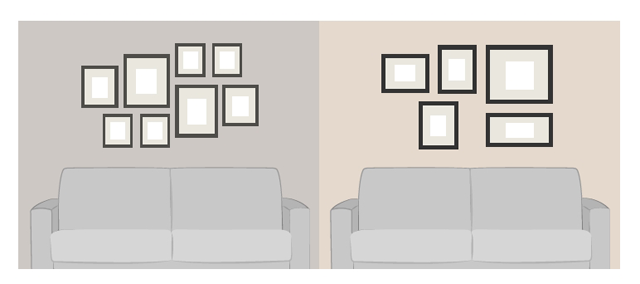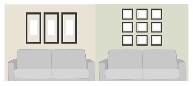 ถ้าห้องมีที่ว่างบนผนังค่อนข้างมาก (เช่น ตั้งแต่ 2.70 เมตรขึ้นไป และเราวางเฟอร์นิเจอร์ทั่วไปบนพื้น จะมีพื้นที่เหลือจนถึงเพดานห้องเยอะ ตัวอย่างเช่น โต๊ะกินข้าวเพียง 75 ซม. โซฟาสูง 70 - 90 ซม.) จะทำให้ห้องดู "โล้นๆ" การติดรูปภาพจะช่วยให้ห้องดูสวย และน่าสนใจขึ้น หลักของการติดรูปภาพมีตามนี้ครับ (1) ติดตรงไหนดี ส่วนใหญ่จะเป็นเหนือโซฟา ผนังทางเดิน หรือเหนือหัวเตียง (2) จะติดกี่รูป ถ้าหลายรูปจะเรียงยังไง ส่วนใหญ่จะมี 2 แบบคือ แบบสมมาตร และแบบ Free Form (3) สีของรูป ควรให้เป็นไปตามสัดส่วน 60 - 30 - 10 ที่พูดถึงในข้อ 2 ข้างต้นครับ