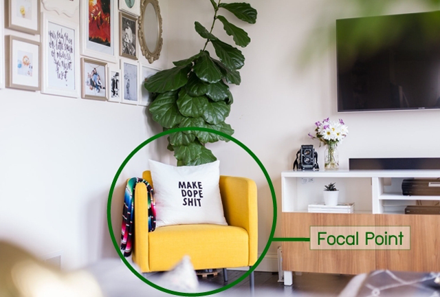 หลักพื้นฐานอย่างหนึ่งในการตกแต่งห้อง หรือตกแต่งอย่างอื่น เช่น สวน คือ ต้องมีจุดดึงดูดสายตา (Focal Point) ซึ่งอาจเป็นสีเด่นๆ สีเดียว แบบ Single Color (ตัวอย่างรูปแรกข้างล่างคือ เก้าอี้สีเหลือง) หรือหลายสีที่ข้ามแม่สีกันแบบ Multiple Colors กัน (ตัวอย่างรูปที่สองคือ กำแพงสีฟ้ากับตัวอักษร Love สีส้ม) การตกแต่งห้องแบบนี้ จะทำให้ห้องมีจุดขัดแย้งดึงดูดสายตา และมีหลายมิติ ทำให้ห้องสวย และน่ามองยิ่งขึ้น