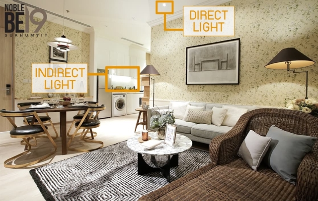 คอนโดบ้านเรามักจะให้ไฟมาแค่ตำแหน่งเดียวคือ บนฝ้าเพดาน ซึ่งจะทำให้มีแสงไฟลงมาเพียงมิติเดียว แต่ถ้าเราใส่แสงไฟเข้าไปหลายๆ จุด จะช่วยทำให้บรรยากาศของห้องน่าอยู่มากขึ้น ไม่ว่าจะเปิดแบบเต็มที่ให้ห้องสว่างสำหรับเวลาทำกับข้าว รับประทานอาหาร หรือเปิดไฟเน้นแค่บางจุด สำหรับอ่านหนังสือ หรือเปิดไฟหลบเป็นจุดเล็กๆ สลัวๆ สำหรับอารมณ์สบายๆ โรแมนติก นอกจากนี้ หลักอีกอย่างของเรื่องไฟคือ ทำไฟแบบส่องโดยตรง (Direct Light) และทำไฟซ่อน หรือไฟหลืบ (Indirect Light) ส่วนใหญ่เราจะให้ความสำคัญกับ Direct Light แต่จริงๆ แล้วแสงไฟที่เสริม Mood & Tone ได้ดีที่สุดคือ Indirect Light (ตัวอย่างตามรูปข้างล่าง)