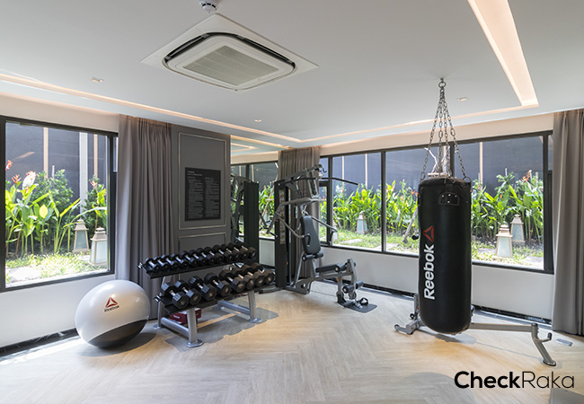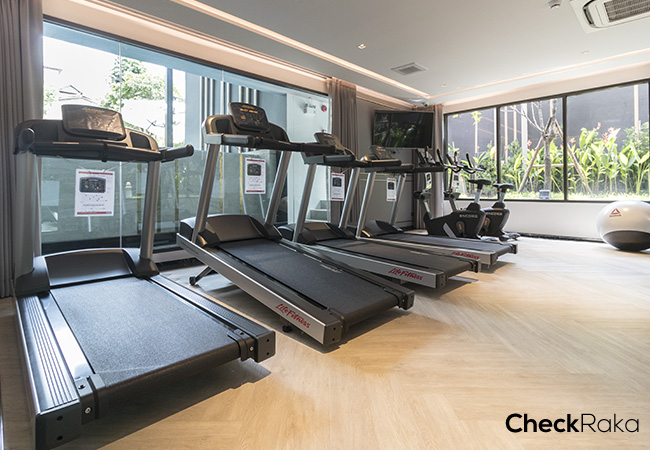 ฟิตเนสจะอยู่ด้านในอาคาร บริเวณชั้น 1 สามารถมองออกไปเห็นวิวสระว่ายน้ำได้ด้วยค่ะ