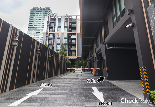 ทางเข้าโครงการ แบ่งช่องทางเข้า - ออก และมีจุดรปภ. แลกรับบัตรสำหรับคนนอก