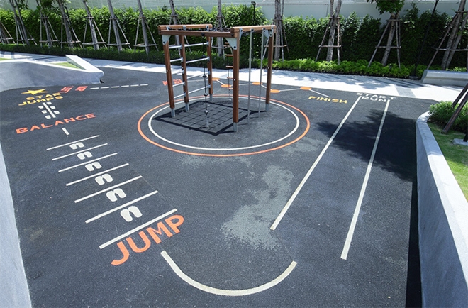 ขอบคุณภาพและข้อมูลจาก https://thinkofliving.com/2018/08/16/sansiri-educational-playground/ "เขย่ง ก้าว กระโดด" ในโครงการ เศรษฐสิริ ปิ่นเกล้า - กาญจนาภิเษก ออกแบบจากแนวความคิด "SANCTUARY ZEN" โดยเน้นความเรียบง่าย สีสันจากธรรมชาติ ไม้ หิน กรวด มาใช้ในการออกแบบพื้น และเลือกชุดเครื่องเล่นเน้นความเรียบง่าย เสริมสร้างพัฒนาการด้านร่างกาย และทักษะการตัดสินใจแก้ปัญหาผ่านการเล่นเกมส์ ที่เน้นการบริหารฝึกก้าว ปีนป่าย การเขย่ง การกระโดด การทรงตัว การกะระยะทาง พร้อมทั้งพัฒนากล้ามเนื้อสำคัญของขาส่วนบน เพื่อความสามารถในการจับ การใช้กำลังแขนผ่านการปีนป่าย ซึ่งแสนสิริคิดและสร้างสรรค์ออกมาให้เป็นมากกว่าสนามเด็กเล่นทั่วๆ ไป
