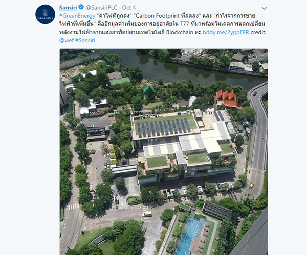 10. Concept ประหยัดไฟฟ้าแสนสิรินำมาใช้จริงโดยใช้พลังแสงอาทิตย์ และ Blockchain แสนสิริ ร่วมมือกับ บีซีพีจี นำร่องแลกเปลี่ยนไฟฟ้าด้วยเทคโนโลยี Blockchain ด้วยการวางระบบพลังงานไฟฟ้าจากแสงอาทิตย์แบบ เพียร์ทูเพียร์ (Peer-to-Peer) ในที่พักอาศัย ประเดิมในโครงการแรกเลยคือ T77 จัดให้มีระบบกักเก็บพลังงานหรือแบตเตอรี่ภายในโครงการ และการเชื่อมโยงกับสายส่งของการไฟฟ้านครหลวง ซึ่งเป็นการหมุนเวียนการใช้พลังงานอย่างเหมาะสมและคุ้มค่าที่สุด