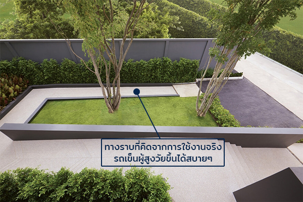 Elderly Care หรือพื้นที่สำหรับผู้สูงอายุ โดยการออกแบบให้ขยายพื้นที่พิเศษ และลดสเต็ปเชื่อมต่อ รองรับสำหรับการใช้รถเข็น ตั้งแต่ประตูทางเข้าห้องนอน พื้นที่ในห้องนอน จนถึงพื้นที่ในห้องน้ำ ทั้งยังเลือกใช้ประตูห้องน้ำแบบบานเลื่อนให้ง่าย หรือแม้กระทั่งการเลือกใช้พื้นแบบ