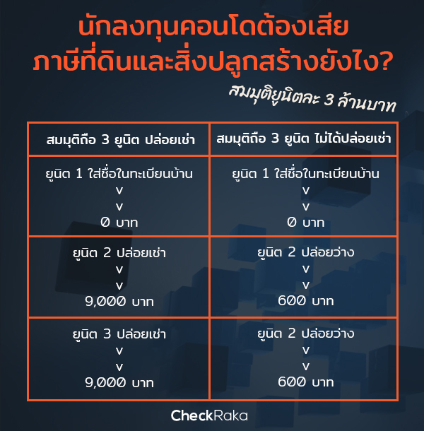 - (3) สำหรับคนมีคอนโดหลายๆ ห้อง ซึ่งไม่ใช่บ้านหลังหลัก (คือมีชื่อเป็นเจ้าของในหนังสือกรรมสิทธิ์ห้องชุด แต่ไม่มีชื่ออยู่ในทะเบียนบ้าน) จำง่ายๆ ก็คือ ถ้าราคาคอนโดพวกนี้แต่ละยูนิตไม่เกิน 50 ล้านบาท และเราไม่ได้ปล่อยเช่า เราจะเสียภาษี 200 บาท สำหรับราคาประเมินห้องชุดทุกๆ 1 ลบ. แต่ถ้าเราปล่อยเช่า เราจะเสียภาษี 3,000 บาท สำหรับราคาประเมินห้องชุดทุกๆ 1 ลบ.