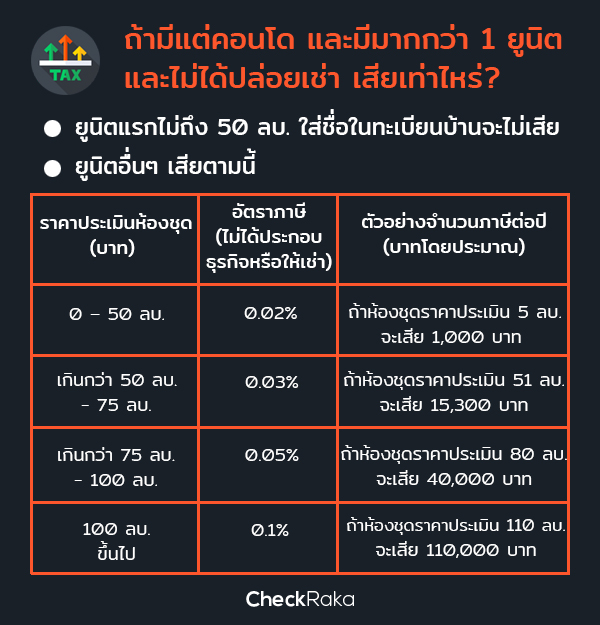 ถ้าเรามีชื่อเป็นเจ้าของกรรมสิทธิ์ในหนังสือกรรมสิทธิ์ห้องชุดของคอนโด 2 ยูนิต และมี 1 ยูนิตที่เรามีชื่อในทะเบียนบ้าน ถ้าราคาประเมินหลังหลักนี้ไม่เกิน 50 ล้านบาท ก็จะไม่เสียภาษีสำหรับหลังแรกนี้ (แต่ถ้าเกิน เช่น 51 ล้านบาท เราจะเสียภาษี 0.03%) ส่วนอีก 1 ยูนิตจะเรียกได้ว่าเป็นบ้านหลังที่สอง หากเราไม่ได้ใช้ประโยชน์ (เช่น ไม่ได้ประกอบธุรกิจ หรือไม่ได้ปล่อยเช่าเลย) เราจะเสียเท่าไหร่ ให้ดูตามราคาประเมินคอนโดจากตารางด้านล่างนี้เลยครับ (และถ้ามี 3 หรือ 4 ยูนิต ก็บวกเข้าไปเรื่อยๆ เช่น ถ้าราคาประเมินยูนิตที่ 3 หรือ 4 นี้ คือ 5 ล้านบาท ก็บวกเพิ่มเข้าไปอีก 2,000 บาท)