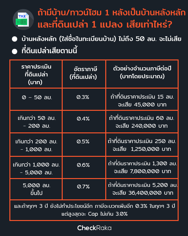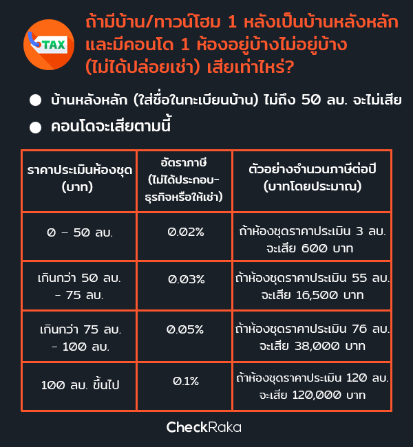 ถ้าเรามีชื่อเป็นเจ้าของกรรมสิทธิ์ในโฉนดที่ดิน 1 หลังที่เราเลือกเป็นบ้านหลังหลัก โดยใส่ชื่อไว้ในทะเบียนบ้าน ถ้าราคาประเมินหลังหลักนี้ไม่เกิน 50 ล้านบาท ก็จะไม่เสียภาษีสำหรับหลังนี้ (แต่ถ้าเกิน 50 ล้านบาท เราจะเสียภาษี 0.03%) ส่วนคอนโด 1 ยูนิตที่อยู่บ้างไม่อยู่บ้าง ไม่ได้ปล่อยเช่าอะไร จะเรียกได้ว่าเป็นบ้านหลังที่สอง หรือบ้านสำรองก็ได้ครับ ซึ่งหากเราไม่ได้ใช้ประโยชน์ (เช่น ไม่ได้ประกอบธุรกิจ หรือไม่ได้ปล่อยเช่าเลย) จะเสียภาษีตามตารางข้างล่างครับ