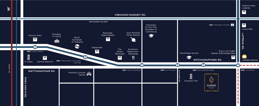 www.siameseratchada.com คอนโดติดรถไฟฟ้า 3 สาย โดยสถานีรถไฟฟ้าที่ใกล้ที่สุดคือ รถไฟฟ้าสายสีเหลืองสถานีรัชดา และเพียง 190 เมตร จากถนนรัชดา จากค่าย แอสเซทไวส์ กับโครงการ