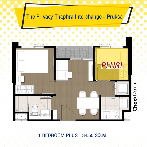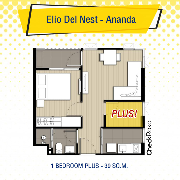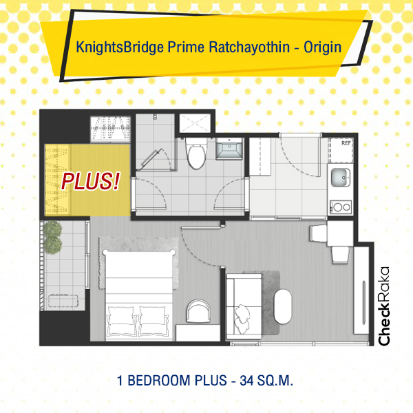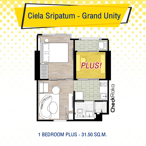 ห้อง 1 Bedroom Plus Type นี้เป็นประตูบานเลื่อนกระจก และอยู่ติดระเบียง มีขนาด 31.50 ตร.ม. แต่แบ่งห้องต่างๆ ให้ออกมามีขนาดเกือบเท่าๆ กัน ดังนั้นห้องนี้ก็เป็นห้องอเนกประสงค์เป็นอะไรก็ได้ค่ะ ใครที่อยู่ 2-3 คน ก็ปรับเป็นห้องนอนก็ได้ แต่ถ้าหากอยู่คนเดียวทำเป็นห้องทำงานก็เหมาะ เพราะการทำงานหรือว่าทำการบ้านควรอยู่ในสภาพแวดล้อมที่เหมาะสม และก็ไม่ควรอยู่ให้ห้องนอน เพราะจะทำให้ง่วงและไม่มีแรงกระตุ้นในการทำงาน