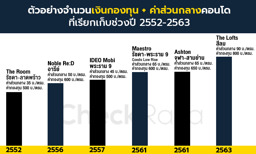 เจ้าของร่วมคอนโดแต่ละยูนิตจะต้องชำระเงินกองทุนคอนโดแค่ครั้งเดียวในวันโอนกรรมสิทธิ์ห้องชุด (แต่อาจมีการเรียกเก็บก้อนใหม่ได้ถ้าก้อนเดิมมีการนำไปใช้) จำนวนที่เก็บจะแล้วแต่ว่าเจ้าของโครงการ (Developer) จะเป็นคนกำหนดตอนแรกครับ ซึ่งส่วนใหญ่ก็จะแตกต่างกันแล้วแต่หลักเกณฑ์ หรือดุลพินิจของเจ้าของโครงการ เช่น ถ้าคอนโดมีส่วนกลางที่ต้องใช้เงินในการบำรุงรักษาเยอะ ทางเจ้าของโครงการก็อาจเรียกเก็บสูงๆ ไว้ก่อน โดยจำนวนที่เรียกเก็บจะคำนวณเป็นบาทต่อขนาดตารางเมตรของพื้นที่ห้องชุด ดังนั้นเราจึงขอยกตัวอย่างทั้งคอนโดเก่าและใหม่ให้เห็นครับว่า จำนวนเงินกองทุนแต่ละโครงการเรียกเก็บกันเท่าไหร่กันบ้าง (สำหรับคอนโดรุ่นใหม่ๆ เงินกองทุนมักจะเป็นจำนวนเฉลี่ยประมาณ 10 เท่าของค่าส่วนกลาง)