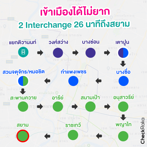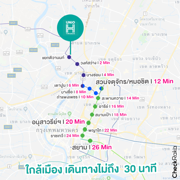 โดยเฉลี่ยแล้วการเดินทางโดยรถไฟฟ้าตั้งแต่ประตูเปิดจนถึงประตูปิดต่อ 1 สถานี เวลาจะอยู่ที่เกือบๆ 2 นาทีค่ะ เราจึงคำนวณกันให้ดูว่าจากโครงการที่อยู่ใกล้สถานีแยกติวานนท์นั้น ถ้าจะเข้าเมืองไปจตุจักร อนุสาวรีย์ฯ หรือสยามจะใช้เวลาประมาณกี่นาที ทั้งนี้ขึ้นอยู่กับช่วงเวลาและความพร้อมของขบวนรถไฟในแต่ละรอบด้วยนะคะ