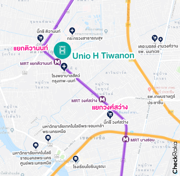 ยูนิโอ เอช ติวานนท์ (Unio H Tiwanon) อยู่เกือบติดทางขึ้น-ลง MRT ทางออกที่ 2 สถานีแยกติวานนท์เลยค่ะ เดินนิดหน่อยเท่านั้นประมาณ 100 เมตร ตรงนี้ก็ถือว่าเป็นจุดเด่นอย่างหนึ่งของโครงการ แทบจะเป็น Door to door เลย ดังนั้นถ้าใครที่เดินทางด้วยรถไฟฟ้าเป็นหลักน่าจะถูกใจสิ่งนี้เป็นพิเศษ