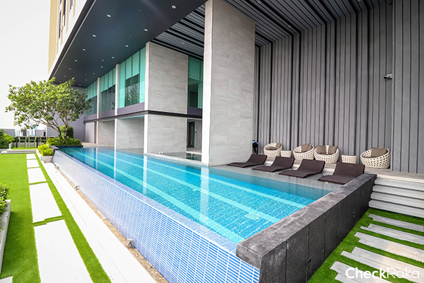 เริ่มกันที่สระว่ายน้ำชั้น 8 ค่ะ เป็นระบบเกลือ สระผู้ใหญ่ขนาด 6.5 x 18 เมตร ลึก 1.2 เมตร