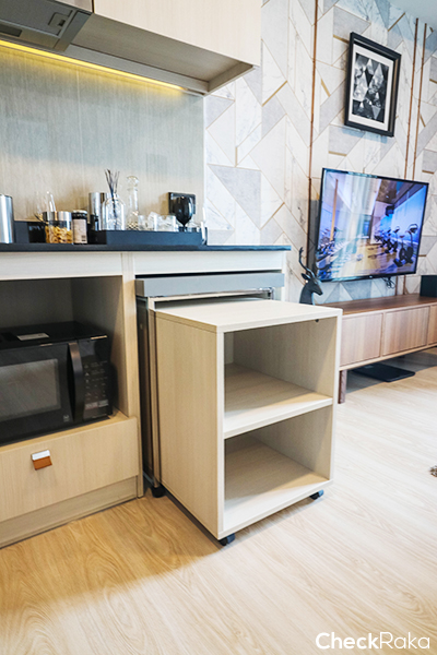 เมื่อเลื่อนโต๊ะ (สีเทา) ออกมาก็จะได้โต๊ะอเนกประสงค์ทานอาหารก็ได้ หรือจะกิจกรรมอื่นๆ ก็ได้