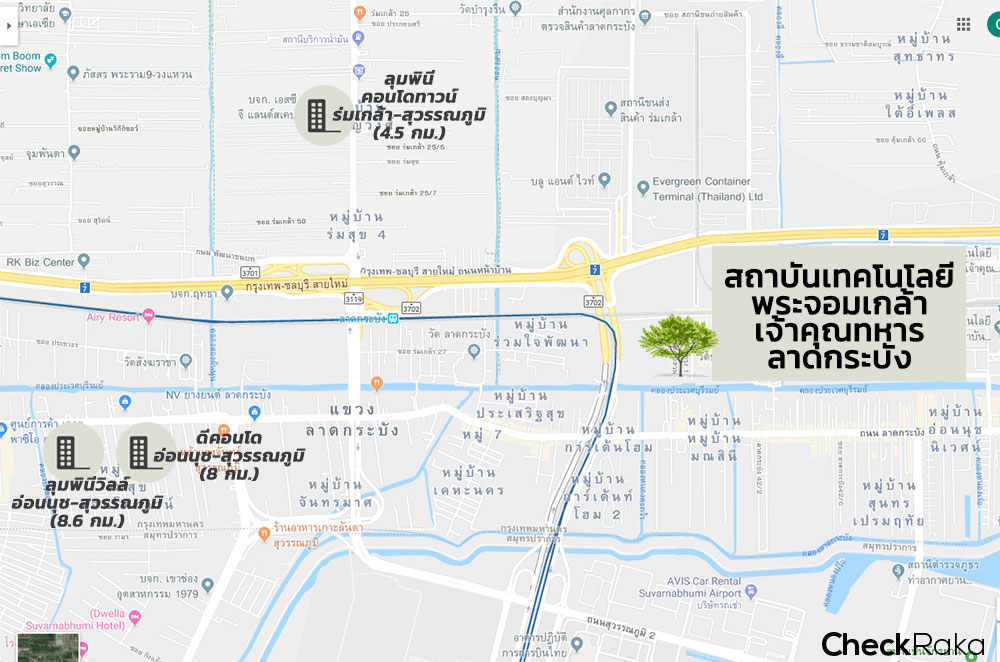 | ลุมพินี คอนโดทาวน์ ร่มเกล้า-สุวรรณภูมิ (สร้างเสร็จ 2559) | Studio (22 ตร.ม.) | 5,800 บ./เดือน |