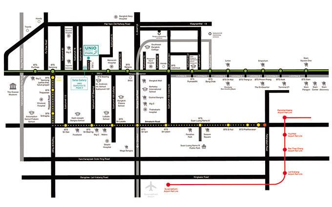 ยูนิโอ สุขุมวิท 72 เฟส 2 (Unio Sukhumvit 72 Phase 2) อยู่ในแปลงที่ดินติดกันกับเฟส 1 ยังคงยึดทำเลในย่านแบริ่ง ซึ่งแบริ่งเนี่ย... แม้จะอยู่โซนสุขุมวิทตอนปลายก็ตาม แต่ไม่ได้แห้งแล้งเลยค่ะ มีโรงเรียน, โรงพยาบาล, ห้างสรรพสินค้าครบครัน และแบริ่งมีรถไฟฟ้า BTS วิ่งผ่าน จะเข้าออกเมืองไม่ได้ยากเลย ส่วนใครที่ใช้รถส่วนตัว ก็ไม่ไกลจากทางด่วน ไม่ว่าจะเป็น ทางพิเศษเฉลิมมหานคร หรือจะใช้เส้นบางนาออกเมืองไปทางพิเศษบูรพาวิถีก็ได้