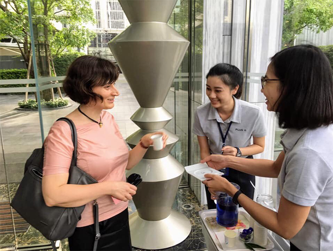 ลูกบ้านยังชื่นใจไปกับน้ำอัญชัญที่เก็บจากแปลงผักของโครงการ